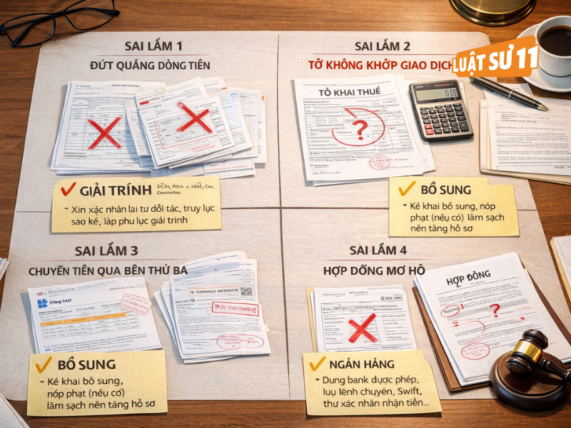 Sai lầm 1: thiếu hoặc không lưu chứng từ gốc dẫn đến “đứt quãng” dòng tiền. Khắc phục bằng cách xin xác nhận lại từ đối tác, truy lục sao kê, và lập phụ lục giải trình.