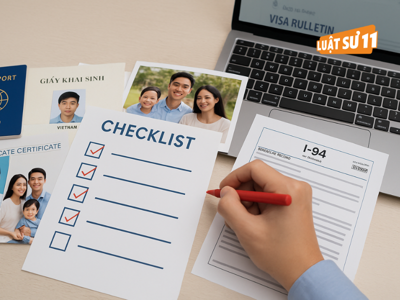 Checklist tối thiểu: hộ chiếu còn hạn; I-94/giấy tờ nhập cảnh; giấy khai sinh; đăng ký kết hôn/ly hôn; bằng chứng sống chung (nếu diện hôn nhân); ảnh thẻ đúng chuẩn; lý lịch tư pháp (nếu cần); bản dịch công chứng. Tất cả phải đồng nhất tên – ngày – địa chỉ với I-485 và I-864. Theo Luật sư 11, nhiều hồ sơ bị chậm chỉ vì sai khác nhỏ (viết tắt tên, lệch ngày sinh). Hãy tạo bảng so khớp dữ liệu để soát từng mục trước khi nộp.