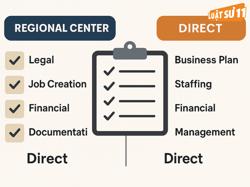 Regional center là mô hình nhà đầu tư góp vốn vào dự án được cơ quan có thẩm quyền chỉ định, dựa nhiều vào báo cáo tác động kinh tế để tính việc làm (gồm trực tiếp, gián tiếp và induced). Ngược lại, direct là hình thức bạn rót vốn vào doanh nghiệp vận hành thực tế và chủ yếu chứng minh việc làm trực tiếp. Trong đi mỹ diện đầu tư, khác biệt này kéo theo yêu cầu chứng cứ, cách thiết kế business plan và mức độ bạn phải tham gia quản trị hàng ngày. Theo Luật sư 11, nếu bạn muốn “cầm tay chỉ việc”, direct là sân chơi tự chủ; nếu ưu tiên tính ổn định và phân tán rủi ro, regional center thường thuận tiện hơn nhờ bộ chứng cứ việc làm đã chuẩn hóa.