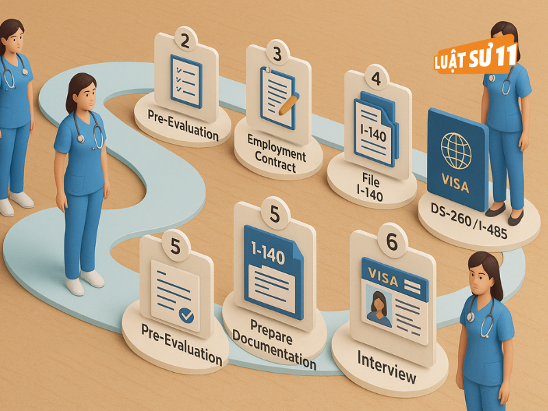 “đi mỹ diện eb3: Schedule A cho điều dưỡng có gì khác? (B1)” chỉ ra ba nhóm điều kiện: (1) Trình độ và chứng chỉ: bằng cử nhân/điều dưỡng đạt yêu cầu tương đương Mỹ; vượt NCLEX-RN hoặc có giấy phép hành nghề RN hợp lệ. (2) Chứng nhận hành nghề quốc tế: VisaScreen (đánh giá năng lực chuyên môn, tiếng Anh và tương đương bằng cấp) là bắt buộc cho hầu hết hồ sơ RN nurse. (3) Nhà tuyển dụng bảo lãnh: bệnh viện/viện dưỡng lão/đơn vị y tế sẵn sàng ký hợp đồng dài hạn, chứng minh khả năng trả lương theo mức prevailing wage. Ngoài ra, ứng viên cần sức khỏe phù hợp, lý lịch tư pháp trong sạch ở mức cho phép, và hồ sơ kinh nghiệm lâm sàng minh bạch. Theo luật sư Nguyễn Thành Huân - Giám đốc công ty Luật sư 11, nhiều hồ sơ bị chậm không phải do thiếu năng lực chuyên môn, mà do thiếu bằng chứng hợp lệ hóa giấy tờ (dịch, công chứng, xác nhận chương trình học).