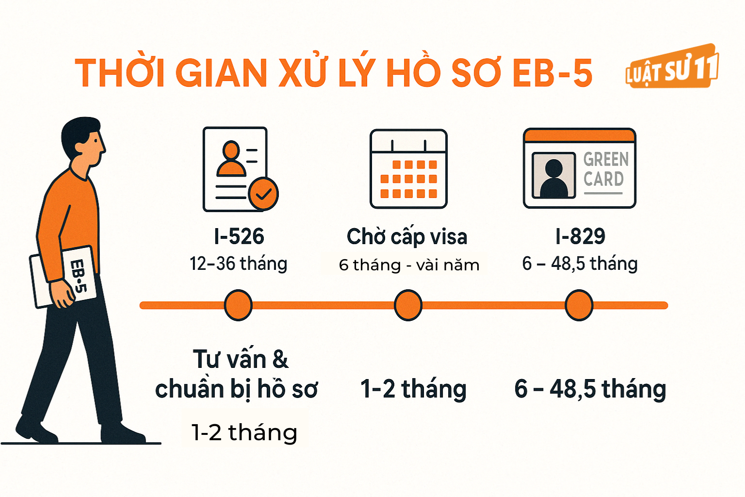 Như vậy, tổng thời gian từ khi bắt đầu nộp I-526 đến lúc nhận được visa EB-5 và sang Mỹ có thể rơi vào khoảng 3,5 năm (thậm chí kéo dài hơn), đầy biến động do quốc tịch nhà đầu tư, dự án đầu tư, khối lượng công việc của USCIS hay tình trạng xử lý tại Trung tâm Thị thực Quốc gia. Trong một số trường hợp được ưu tiên hoặc thuộc nhóm hiếm khi quá tải, thời gian xử lý có thể được rút ngắn đáng kể.