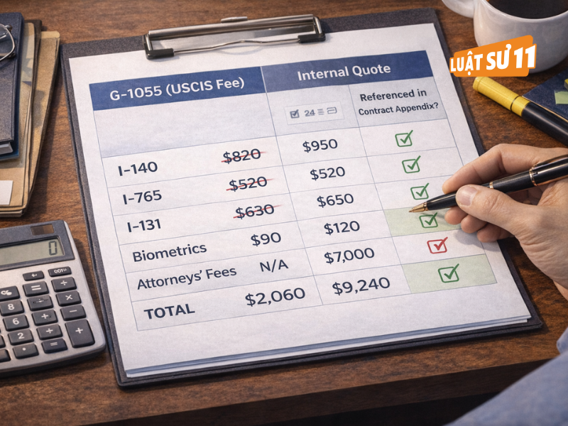 Vì dễ lẫn phí chính phủ với phí luật sư. Hãy yêu cầu tách bạch và dẫn chiếu G-1055 cho phần lệ phí theo phí USCIS 2026. Như vậy, phần việc nào – phí nào đều có căn cứ.